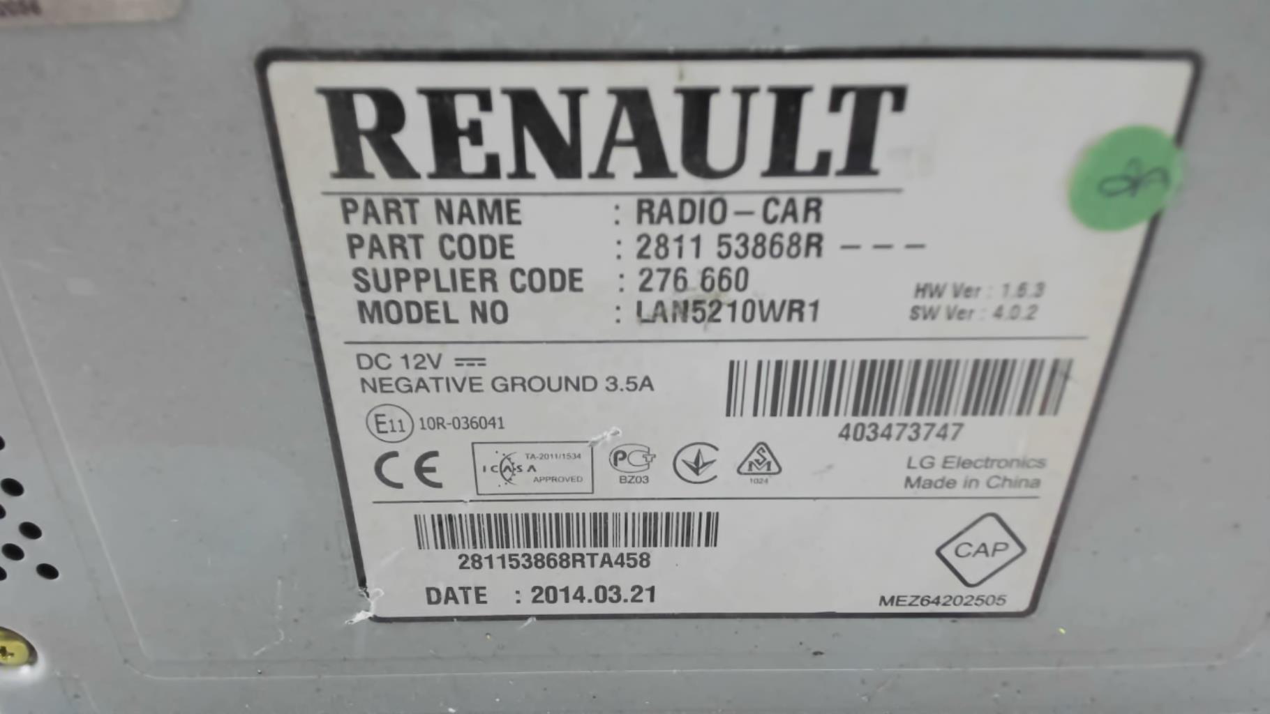 | description | Marque : lg electrinics Référence : 281153868R Code autoradio : Avec |