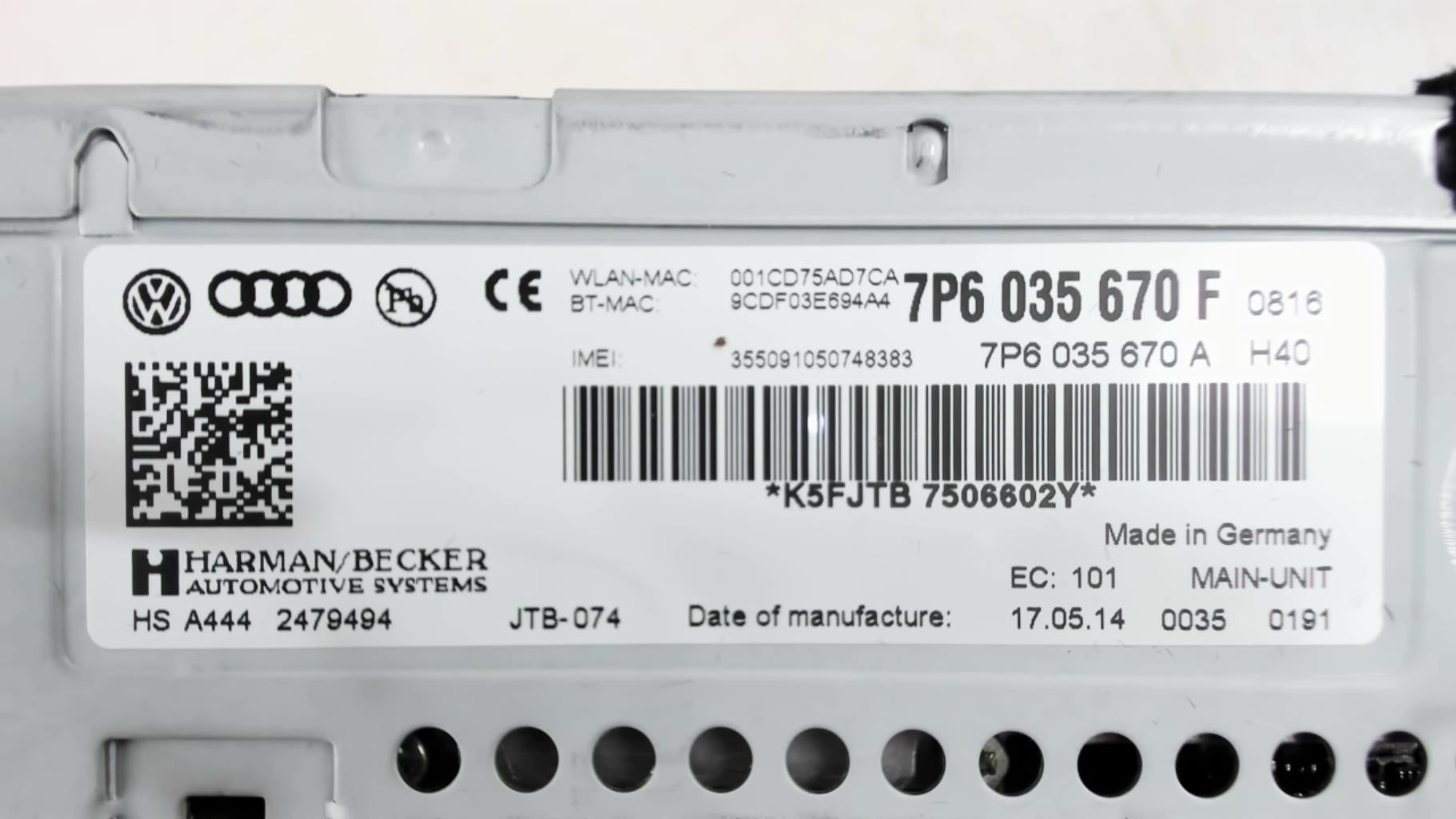 | description | Type : Cd Marque : harman becker Référence : 7P6035670F Code autoradio : Inconnu |