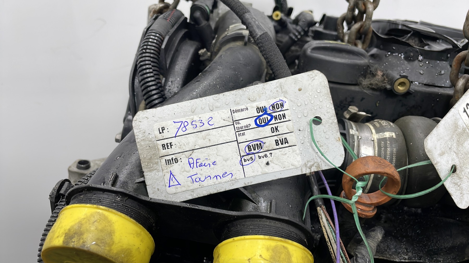 | description | Kilométrage : 157 000 Code moteur : 9HN Marque injection : bosch Démarrage sur véhicule : Non Tests et contrôles : Ok Etat des caches et carters : Bon Etat du faisceau électrique : Bon Type boîte de vitesse : Manuelle Infos / Détails : Néant |