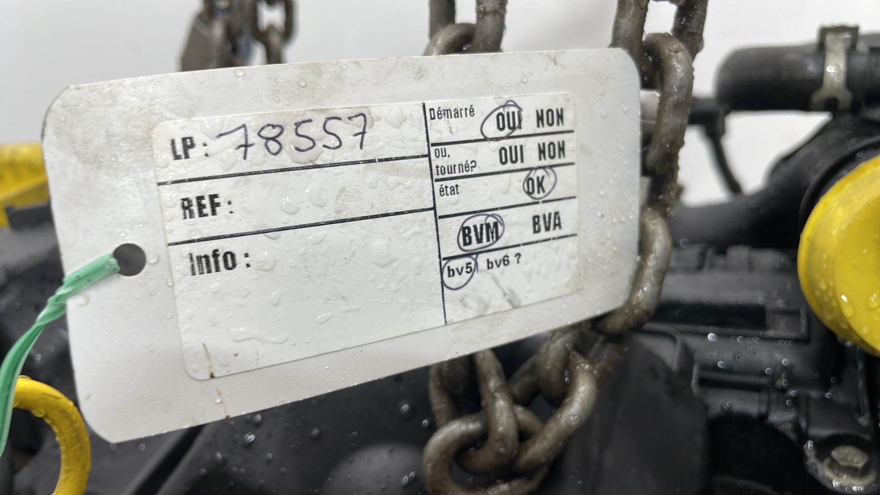 | description | Kilométrage : 190 000 Code moteur : K9K 766 Marque injection : delphi Démarrage sur véhicule : Oui Tests et contrôles : Ok Etat des caches et carters : Bon Etat du faisceau électrique : Bon Type boîte de vitesse : Manuelle Infos / Détails : Néant |
