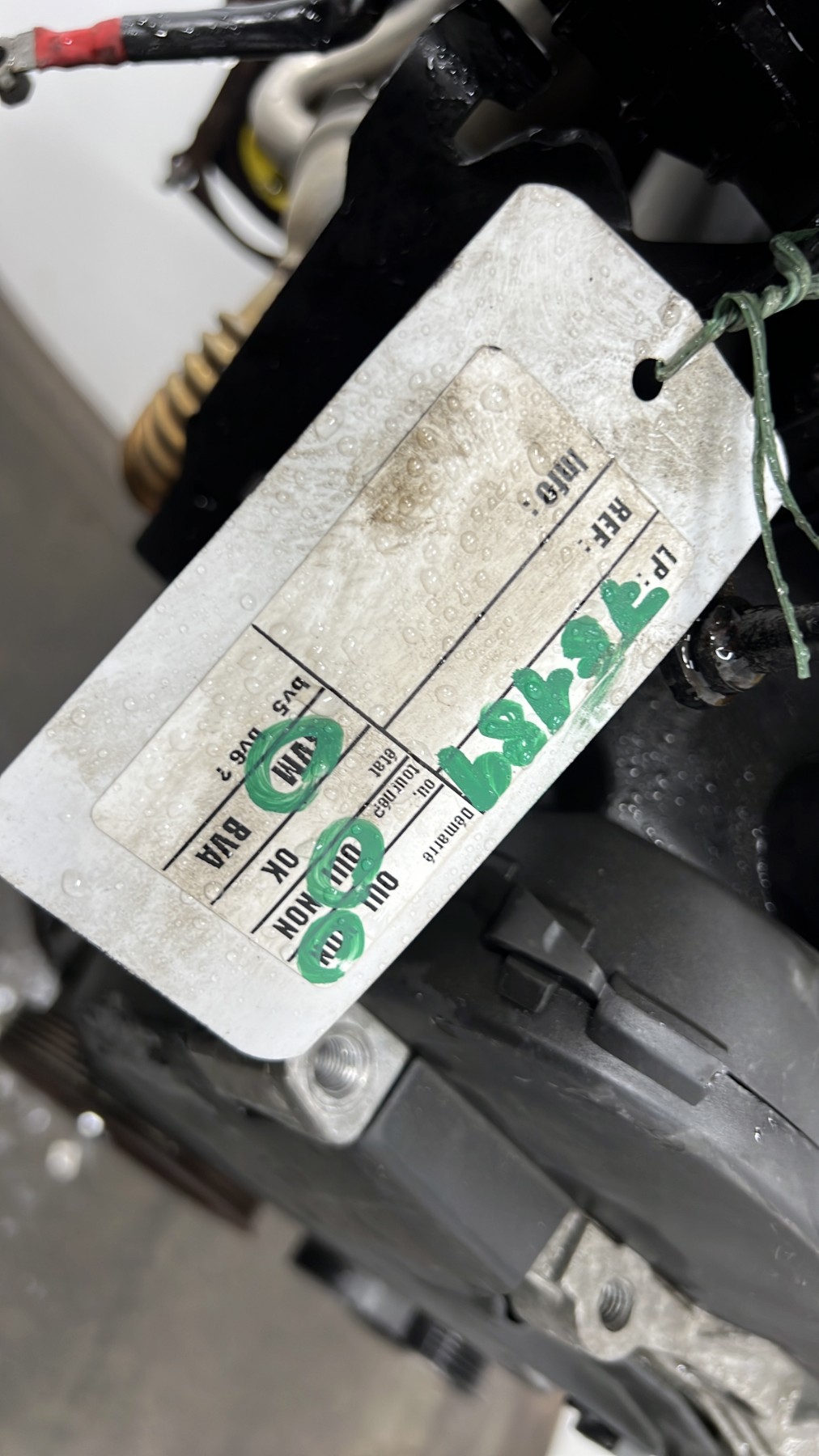 | description | Kilométrage : 165 000 Code moteur : K9K_740 Marque injection : delphi Démarrage sur véhicule : Non Tests et contrôles : Ok Etat des caches et carters : Bon Etat du faisceau électrique : Bon Type boîte de vitesse : Manuelle Infos / Détails : Néant |